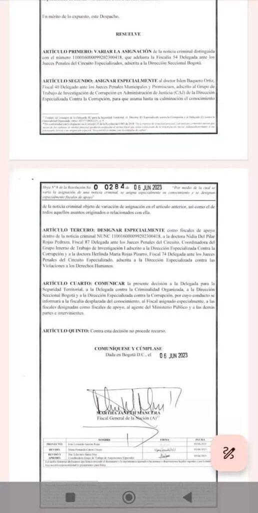 De esta manera el Grupo de Trabajo de Asignaciones Especiales el 5 de junio de 2023, asignó a Islen Baquero Ortiz, fiscal 40 delegado ante los jueces municipales y promiscuos, adscrito al Grupo de Trabajo de Investigación de Corrupción en Administración de Justicia (CAJ), para que continúe con el conocimiento de dicha investigación.