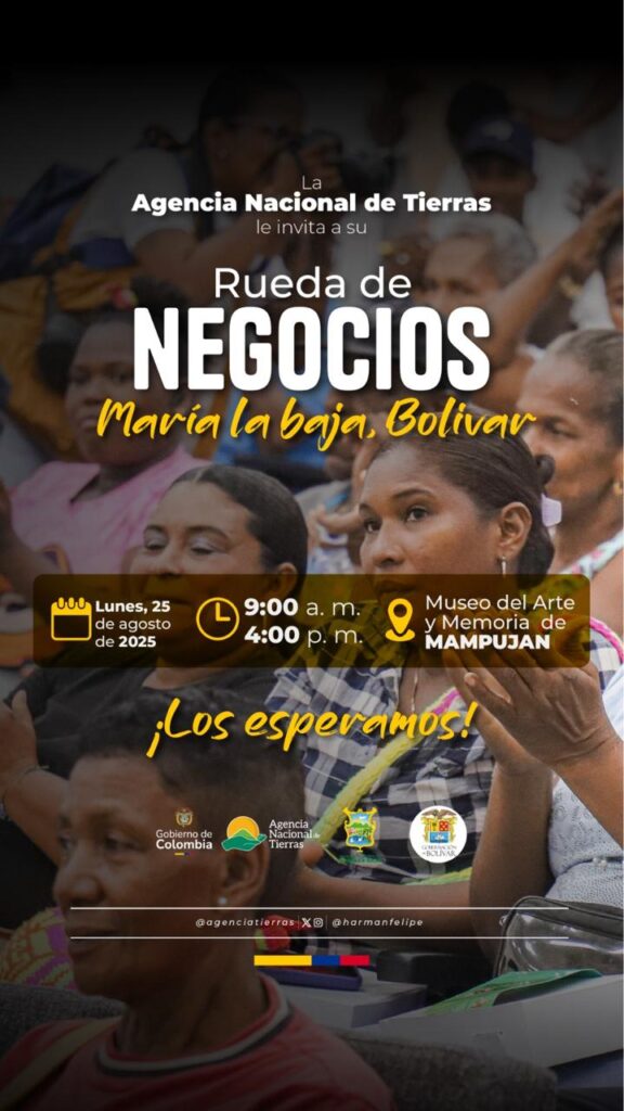 Con el propósito de acelerar la Reforma Agraria en Bolívar, la Agencia Nacional de Tierras —ANT— realizará el próximo 25 y 26 de agosto dos ruedas de negocios, en las que ganaderos y propietarios podrán ofertar sus predios en los municipios de María la Baja y Magangué, para cooperar con este importante proceso de transformación agraria.
