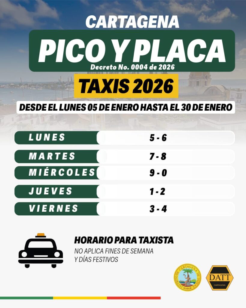 #Cartagena | La Alcaldía Mayor de Cartagena, a través del Departamento Administrativo de Tránsito y Transporte- DATT, informa a la ciudadanía que, mediante el Decreto N° 0004 de 2026, se adoptan las nuevas medidas de restricción de circulación vehicular (pico y placa) para los vehículos de transporte público individual de pasajeros tipo taxis en el Distrito.