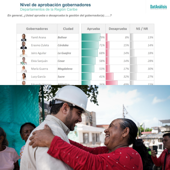 Estos resultados consolidan a Bolívar como el departamento con mayor respaldo ciudadano en la región Caribe, destacándose no solo por su alto nivel de aprobación, sino también por la diferencia frente a sus pares.Analistas coinciden en que estos indicadores suelen estar asociados a factores como la ejecución efectiva de proyectos, la cercanía con las comunidades y la capacidad de respuesta frente a las necesidades prioritarias del territorio.Con 12 megacolegios entregados, 27 acueductos en construcción, la inversión más alta que haya ejecutado una Gobernación de Bolívar en infraestructura vial en Cartagena, entre otros proyectos, han generado el respaldo ciudadano a la gestión de Arana.
